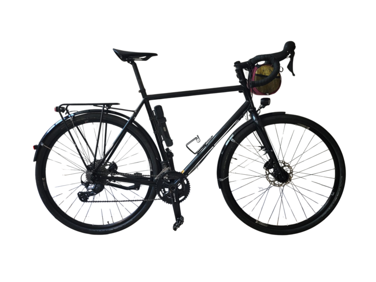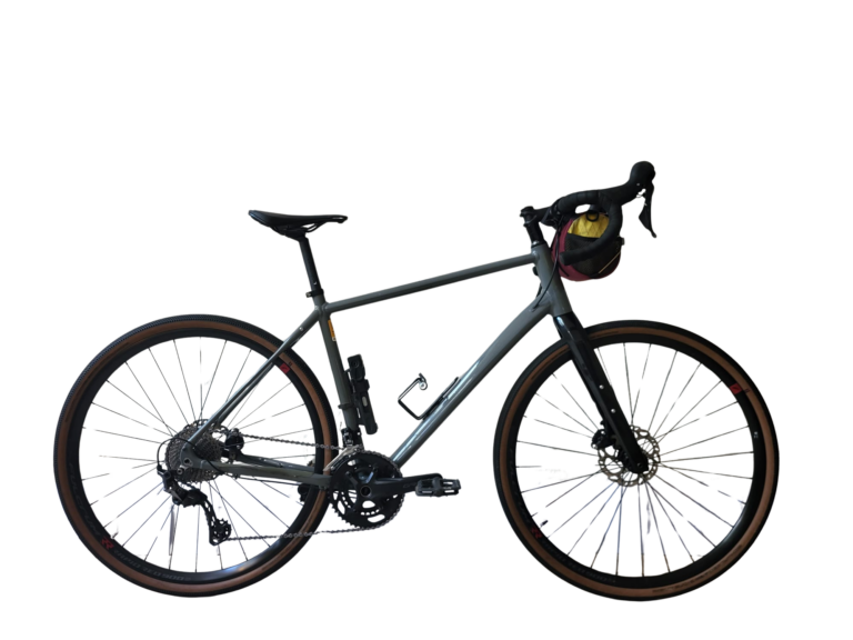 Cadre en acier – Guidon de route- Freins hydrauliques sur disque – GRX avec 2×11 vitesses – éclairage (dynamos dans le moyeux) – Porte bagage arrière – Garde-boues