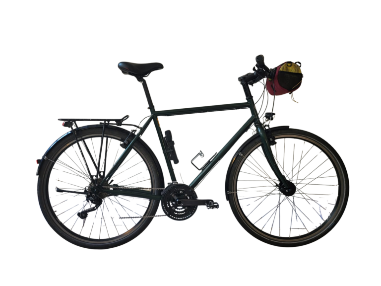 Modèle: INTEC T07 — Transmission Deore 3×10 vitesses, freins sur jante, pneus Schwalbe Marathon 700x38mm, porte-bagages ou l’on peut mettre 2 sacoches de 20 litres, éclairage via une dynamo dans le moyeu, garde-boues.